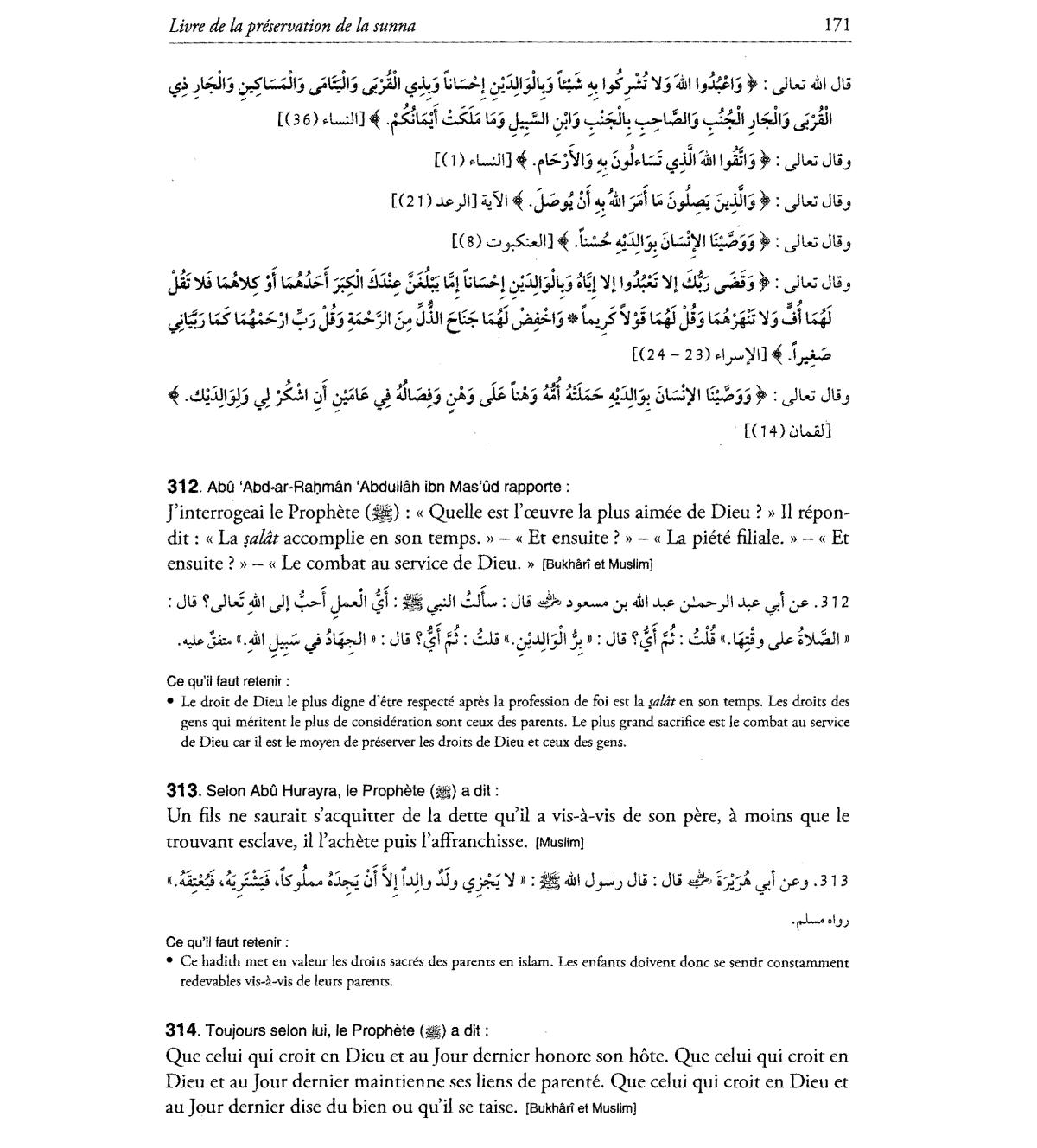 • Ce hadith met en valeur les droits saeres des parents en islam. Les enfams doivem done se sentir eonstammem