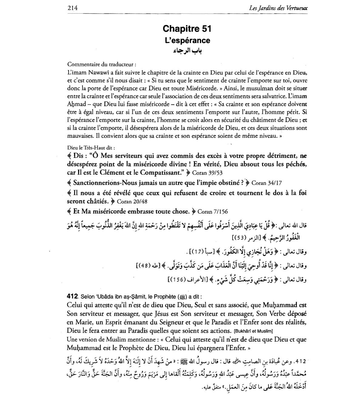 Limam Nawawi a fait suivre Ie chapitre de Ia crainte en Dieu par celui de l'esperance en Dieu,