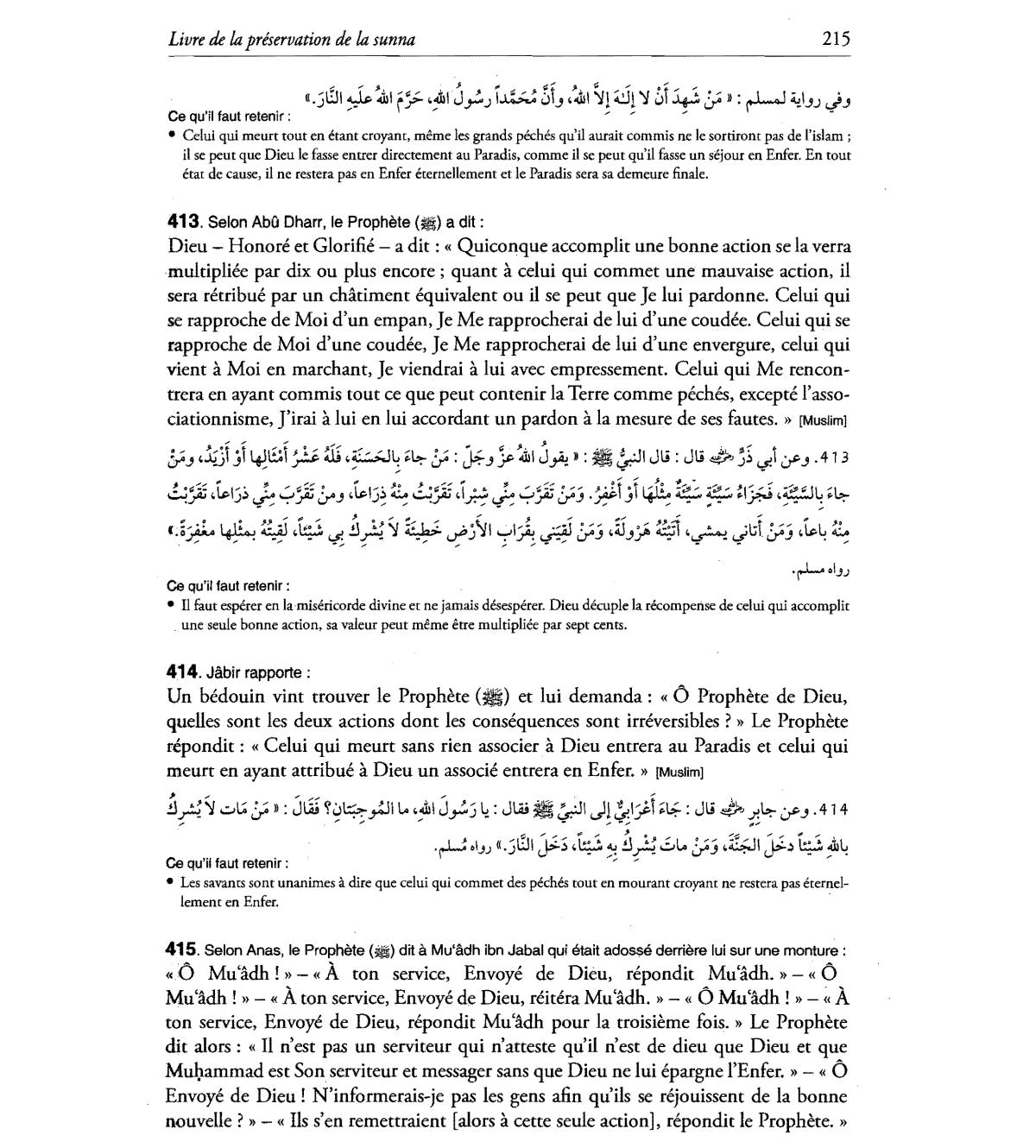 • Celui qui meurt tout en etant croyant, meme les grands peches qu'il aurait commis ne Ie sortiront pas de I'islam ;