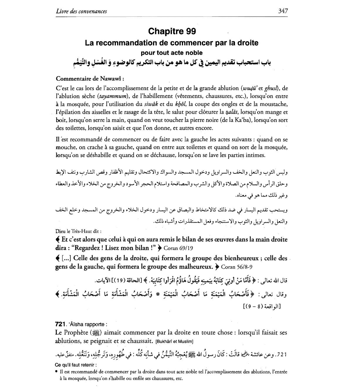 droite dans tout acte noble tell'accomplissement des ablutions, l'entree