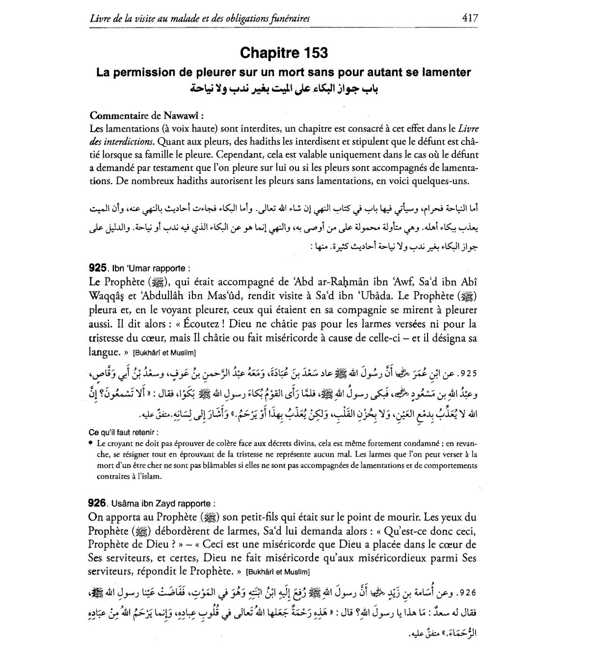 tions. De nombreux hadiths autorisent les pleurs sans lamentations, en void quelques-uns.