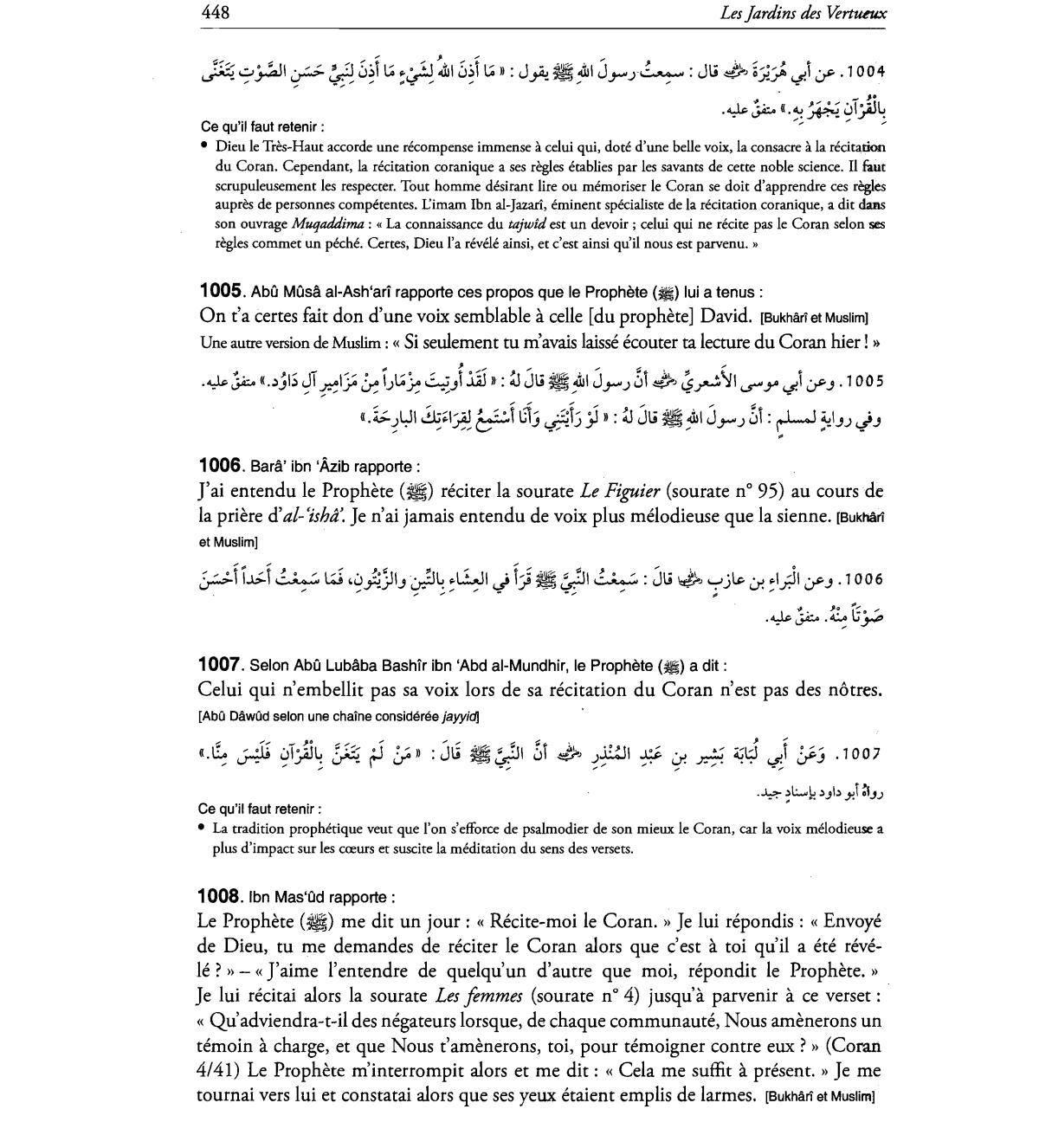 • La tradition prophetique veut que l'on s'efforce de psalmodier de son mieux Ie Coran, car la voix melodieuse a