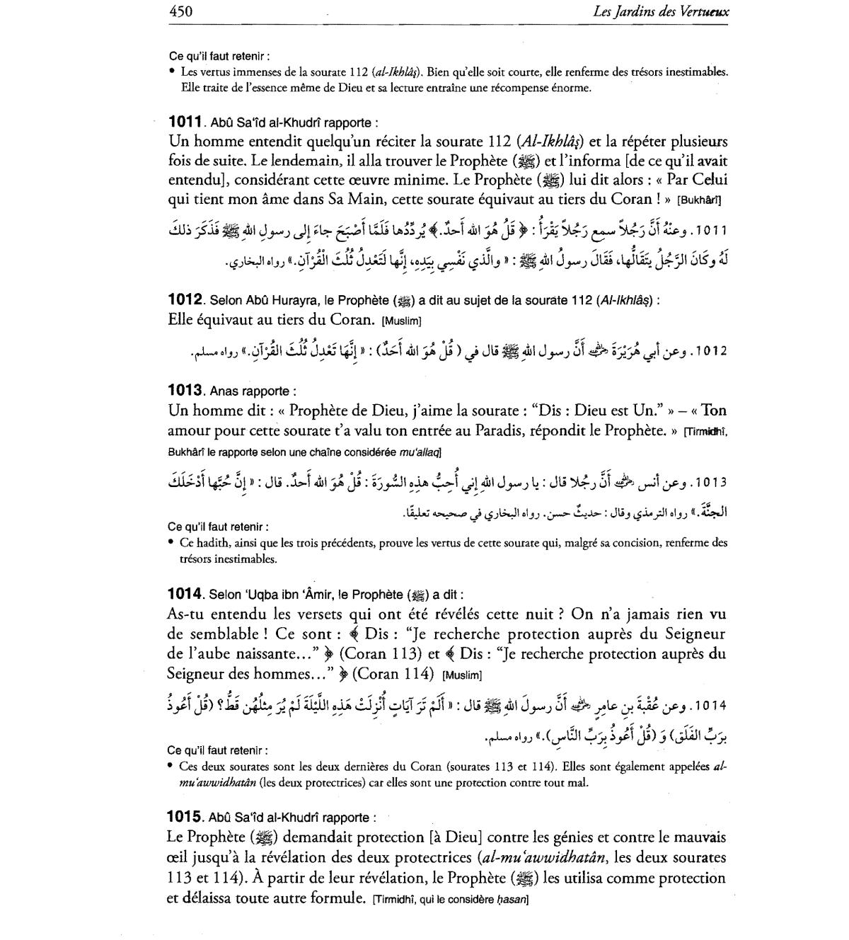 • Ce hadith, ainsi que les trois precedents, prouve les vertus de cette sourate qui, malgre sa concision, renferme des
