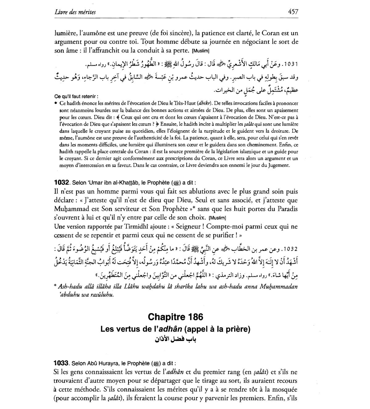 lumiere, l'aumone est une preuve (de foi sincere), la patience est darte, Ie Coran est un