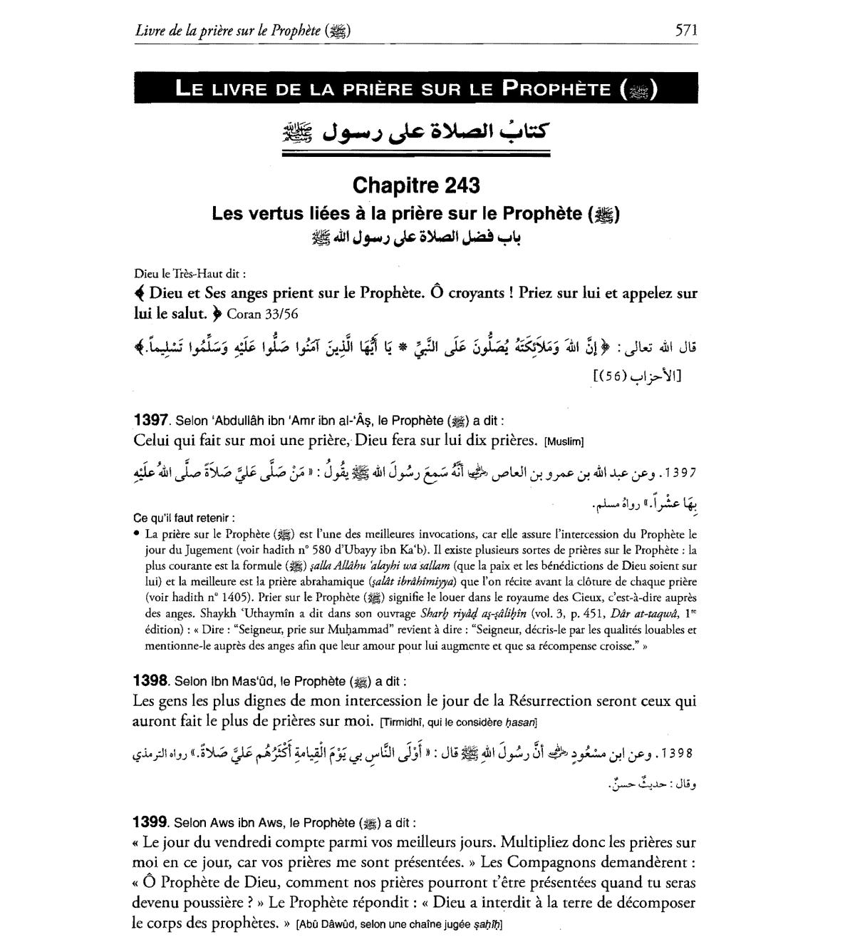 jour du Jugement (voir hadith n° 580 d'Ubayy ibn Ka'b). II existe plusieurs sortes de prieres sur Ie Prophete : la
