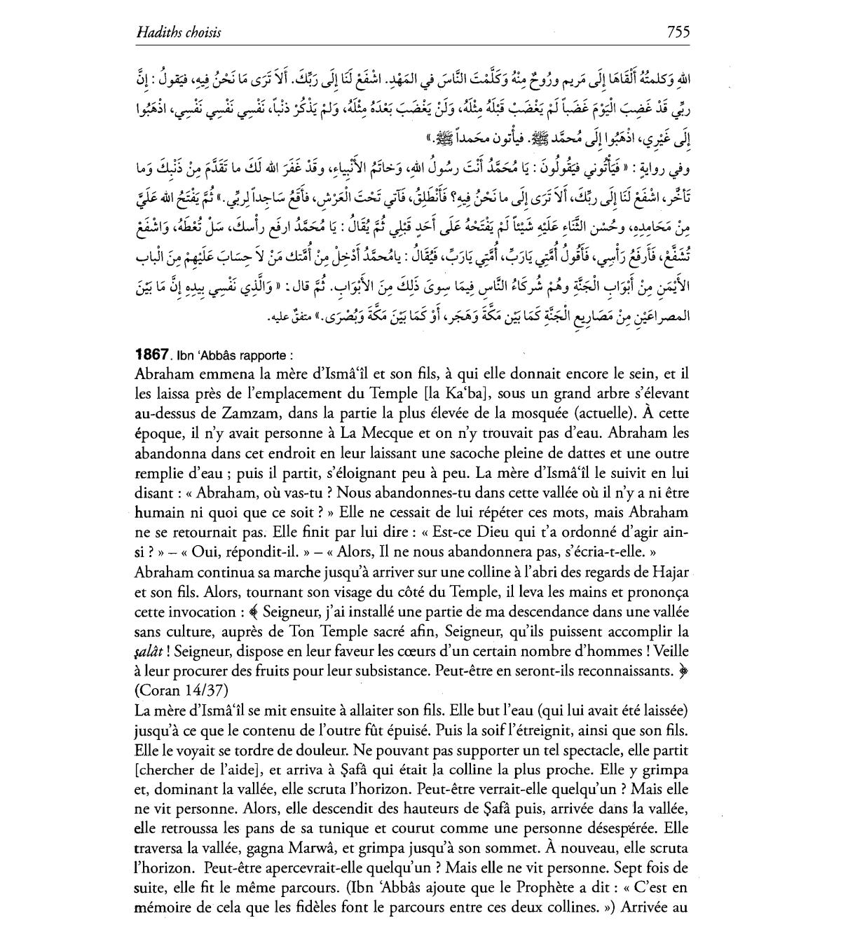 Abraham emmena la mere d'Isma'll et son fils, a qui elle donnait encore Ie sein, et il