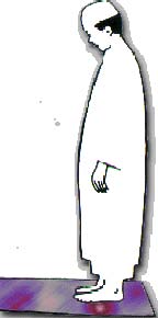 Now Saying "Allahu Akbar" Prostrate on the ground with your forehead, the knees, the nose & palms of both hands touching the ground. In this position(Sajdah - as in fig. 5 repeat these words three times at least: Subhana Rab Bi Yal A'Ala Glory to my Lord, the most high. Subhana Rab Bi Yal A'Ala Glory to my Lord, the most high. Sit upright with knees still on the ground after a moments rest perform the second Sajdah saying: Allahu Akbar Allah is the greatest. In the second sajdah as before recite the following word thrice: Subhana Rab Bi Yal A'Ala Glory to my Lord, the most high. This completes on rakah of Salah. The second rakah is said in the same way except that after the second Sajdaj you sit back, with the left foot bent towards right, which should be placed vertical to the mat. The palms should be lifted from the mat & placed on the knees. In this position (Q'adah-as showm in fig. 6 & 7) silently say these words(Tashahhud): At Ta Ya To Lil Lahi Wa Sala Wato Wa Tay Yi Bato All prayers & Worship through words, action & sanctity are for Allah only. As Sa La Mo Alaika Ay Yo Han Na Biy Yo Peace be on you, O Prophet. Wa Rah Ma Tul La Hi Wa Bara Ka To Hu and mercy of Allah and His blessings. As Salmu Alaina Wa Ala Iba Dil Lahis Saliheen Peace be on us & on those who are righteous servants of Allah. Ash Had Du Al La Ilaha Il La Laho I bear witness tp the fact that there is no diety but Allah. Wa Ash Ha Du An Na Muhammadan Ab Du Hu And I bear witness that Muhammad is his slave & messenger. |