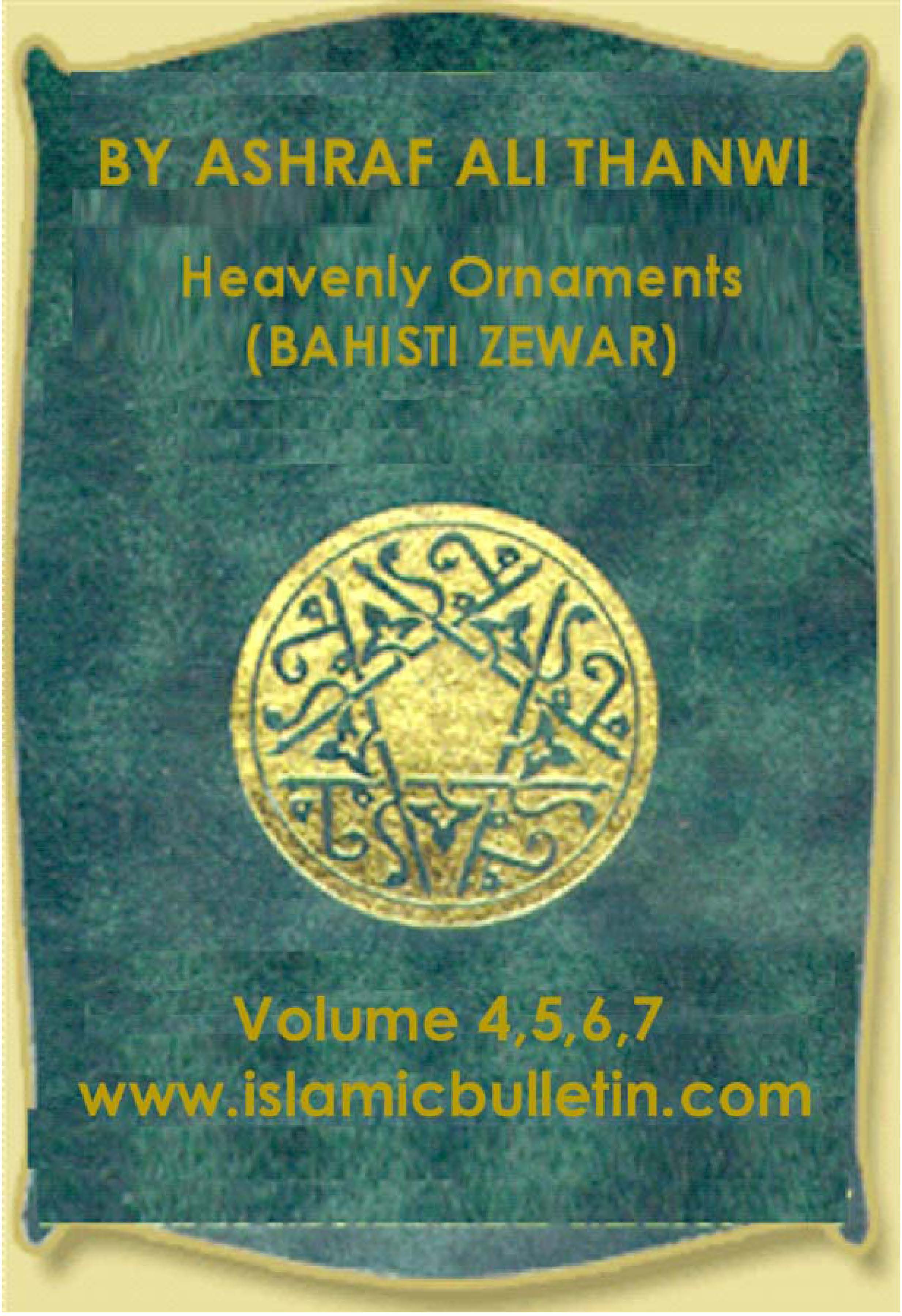 Bahishti Zewar (translated as Heavenly Ornaments), was written by Maulana Ashraf Ali Thanvi Rahmatullahe Alaihe. is a 8 volume comprehensive handbook of fiqh (jurisprudence), especially for the education of girls and women. This volume has been compiled by the Islamic Bulletin www.islamicbulletin.com into two separate books. Volume 1,2, 3 and the second volume 4,5,6, 7. It describes the Five Pillars of Islam and also highlights more obscure principles. For years it has remained a favorite with the people of the Indo-Pakistan subcontinent. Among (Hanafi Deobandi) Muslims, it is a popular practice to present this volume to a new bride. The motivation behind this gesture is that the young woman is taking up a new identity and new life as a wife and mother-to-be. She should be well versed in the rites, rituals and tradition of Islam.