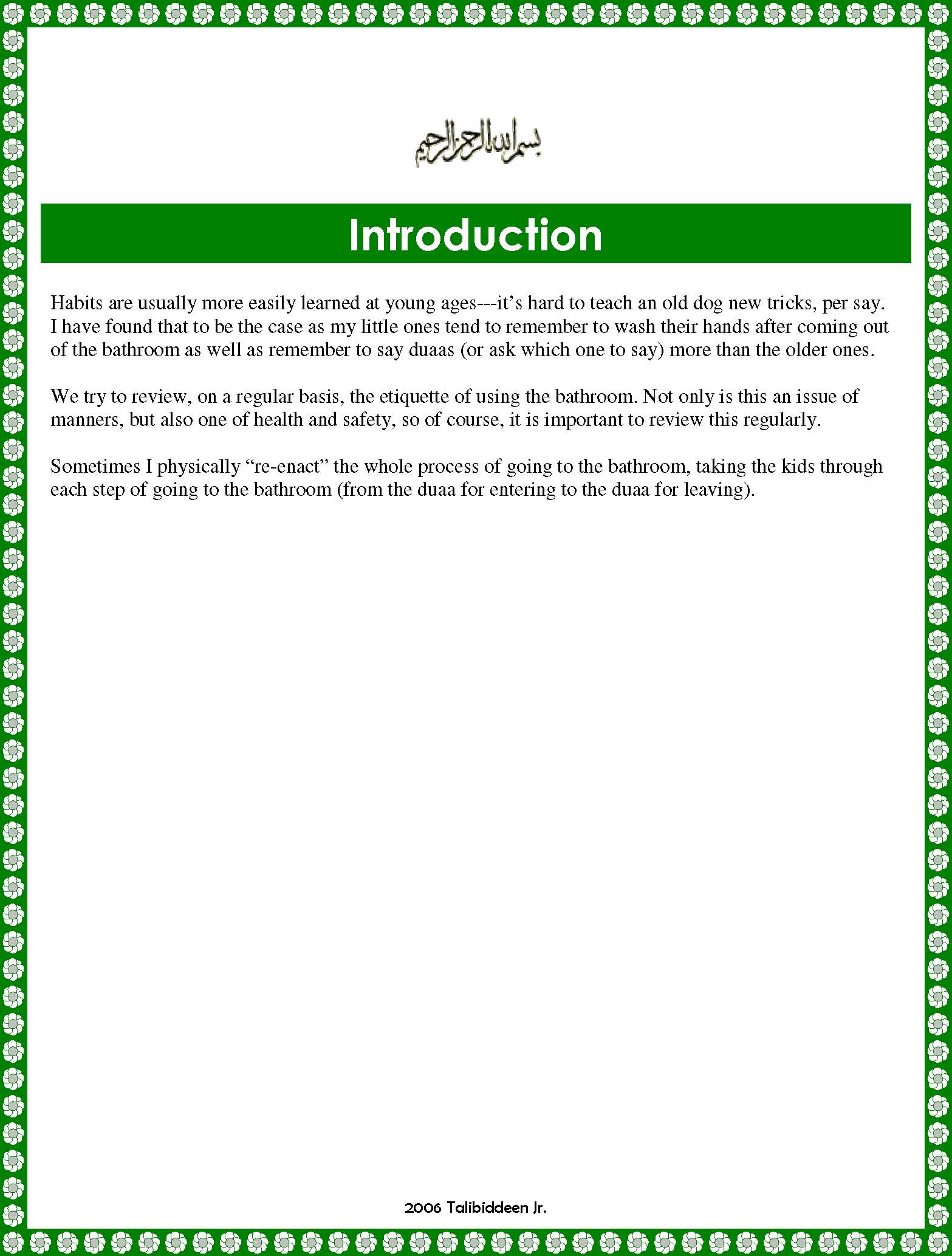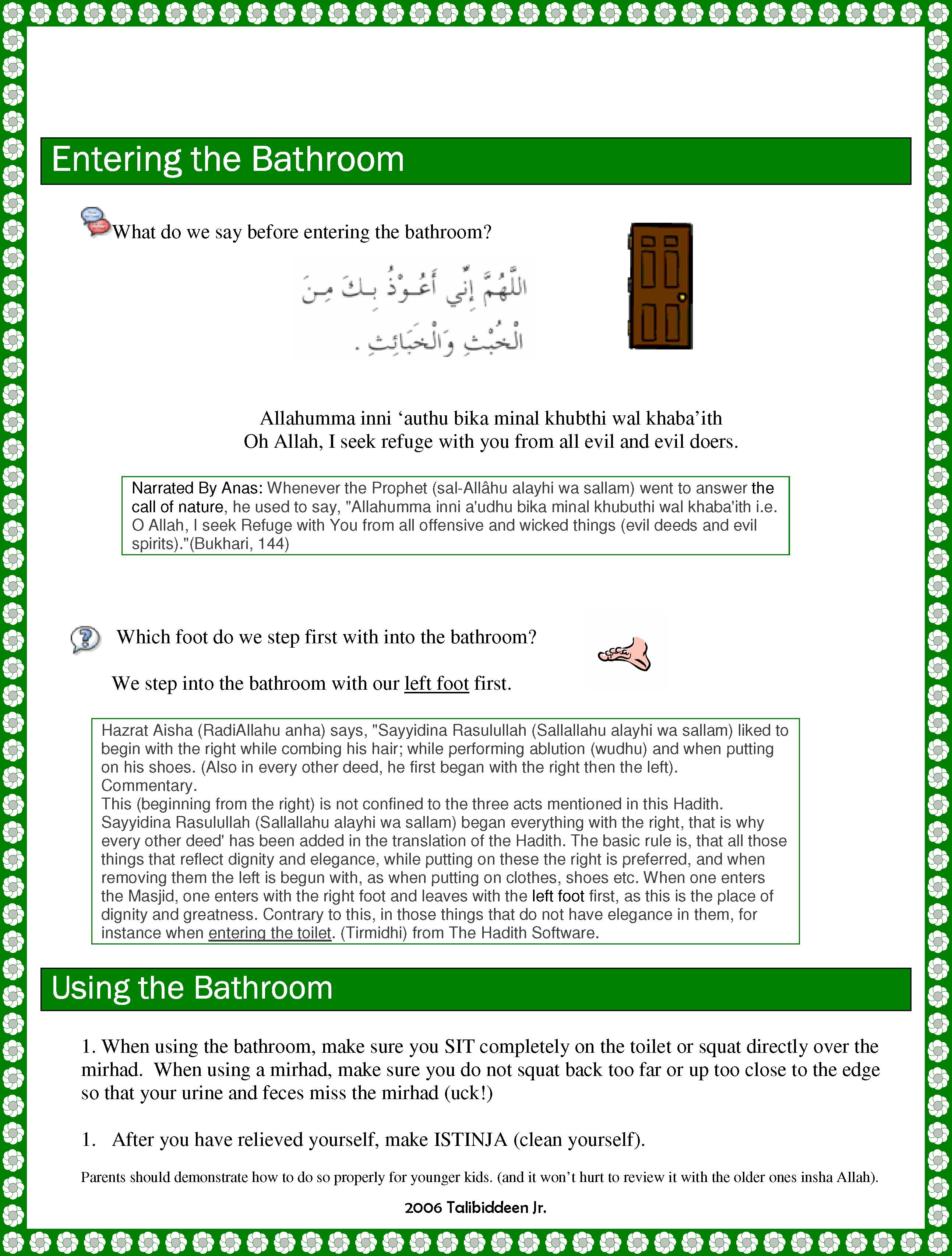 Habits are usually more easily learned at young ages---it’s hard to teach an old dog new tricks, per say. I have found that to be the case as my little ones tend to remember to wash their hands after coming out of the bathroom as well as remember to say duaas (or ask which one to say) more than the older ones. We try to review, on a regular basis, the etiquette of using the bathroom. Not only is this an issue of manners, but also one of health and safety, so of course, it is important to review this regularly. Sometimes I physically “re-enact” the whole process of going to the bathroom, taking the kids through each step of going to the bathroom (from the duaa for entering to the duaa for leaving).