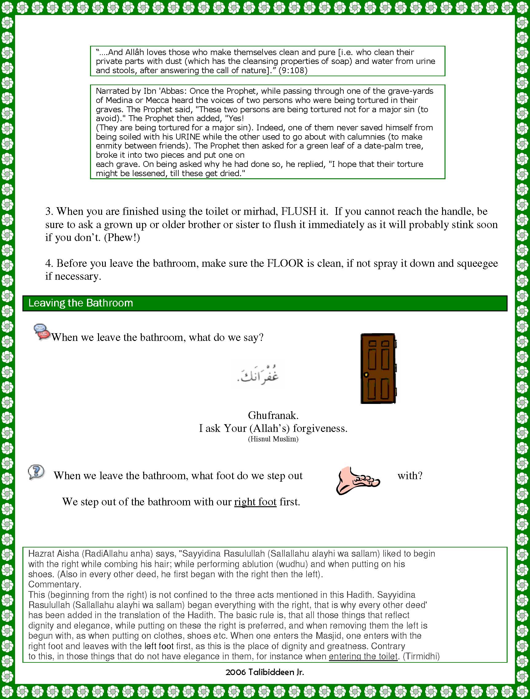 HazratAisha(RadiAllahuanha)says,"SayyidinaRasulullah(Sallallahualayhiwasallam)likedto beginwiththerightwhilecombinghishair;whileperformingablution(wudhu)andwhenputting onhisshoes.(Alsoineveryotherdeed,hefirstbeganwiththerightthentheleft). Commentary. This(beginningfromtheright)isnotconfinedtothethreeactsmentionedinthisHadith. SayyidinaRasulullah(Sallallahualayhiwasallam)beganeverythingwiththeright,thatiswhy everyotherdeed'hasbeenaddedinthetranslationoftheHadith.Thebasicruleis,thatallthose thingsthatreflectdignityandelegance,whileputtingonthesetherightispreferred,andwhen removingthemtheleftisbegunwith,aswhenputtingonclothes,shoesetc.Whenoneenters theMasjid,oneenterswiththerightfootandleaveswiththeleftfootfirst,asthisistheplaceof dignityandgreatness.Contrarytothis,inthosethingsthatdonothaveeleganceinthem,for instancewhenenteringthetoilet.(Tirmidhi)fromTheHadithSoftware.