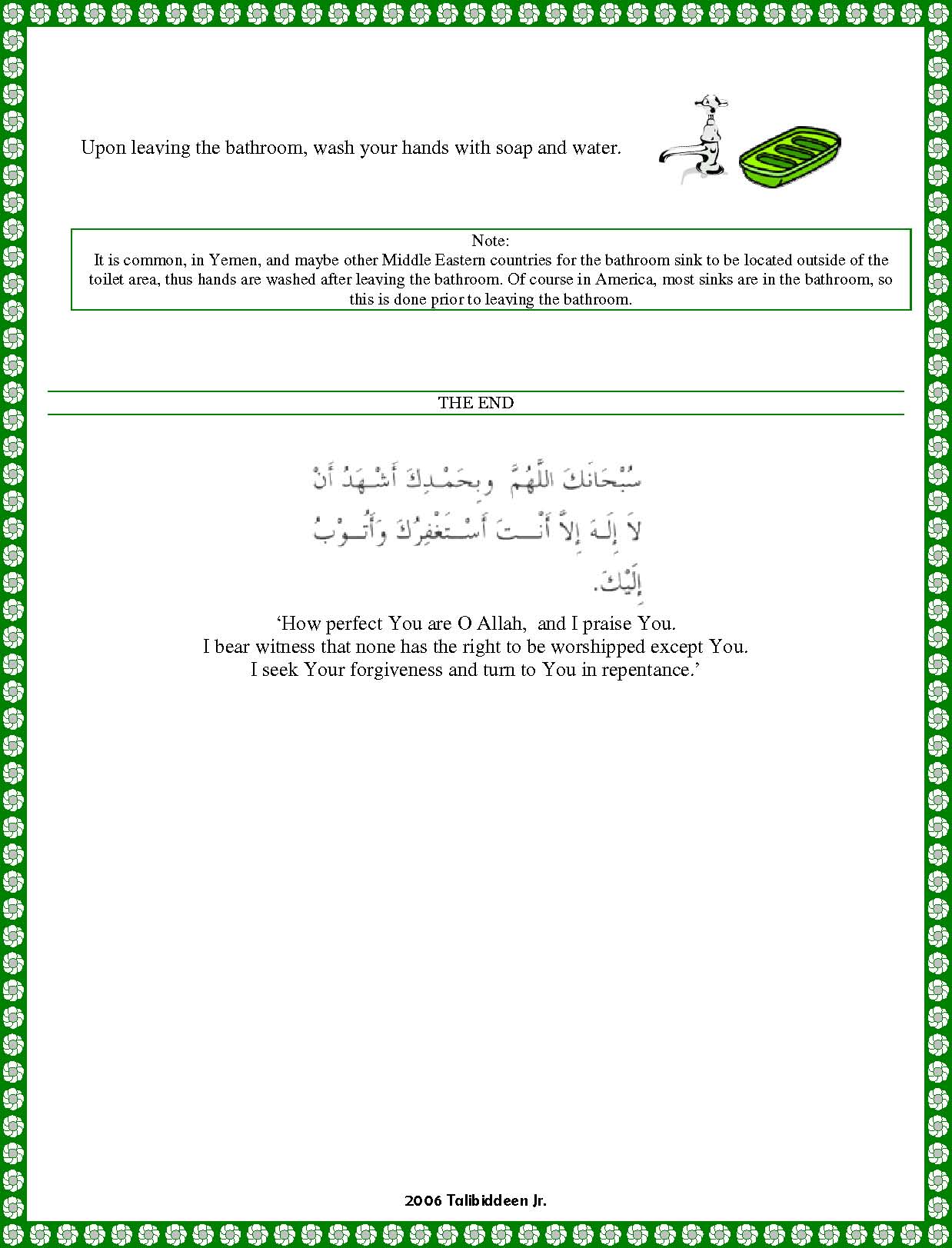 Note: It is common, in Yemen, and maybe other Middle Eastern countries for the bathroom sink to be located outside of the toilet area, thus hands are washed after leaving the bathroom. Of course in America, most sinks are in the bathroom, so this is done prior to leaving the bathroom.